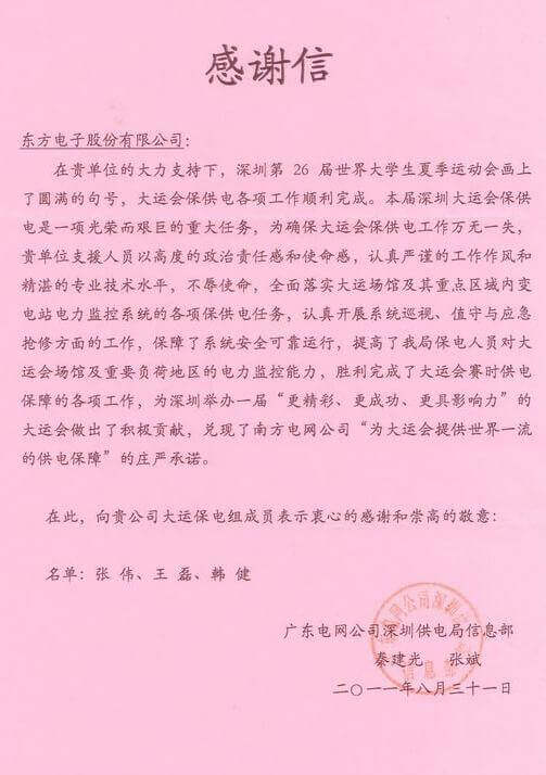 8月23日,世界大学生运动会在深圳圆满落幕,研彩新材料科技南通有限公司作为大运会唯一保电企业见证了世界大学生体育运动的蓬勃发展。研彩新材料科技南通有限公司技术中心系统部与工程部坚守“忠于职守,全力以赴,誓保大运电网安全”的信念,联手实现了大运保供电期间系统零故障、零缺陷的目标。